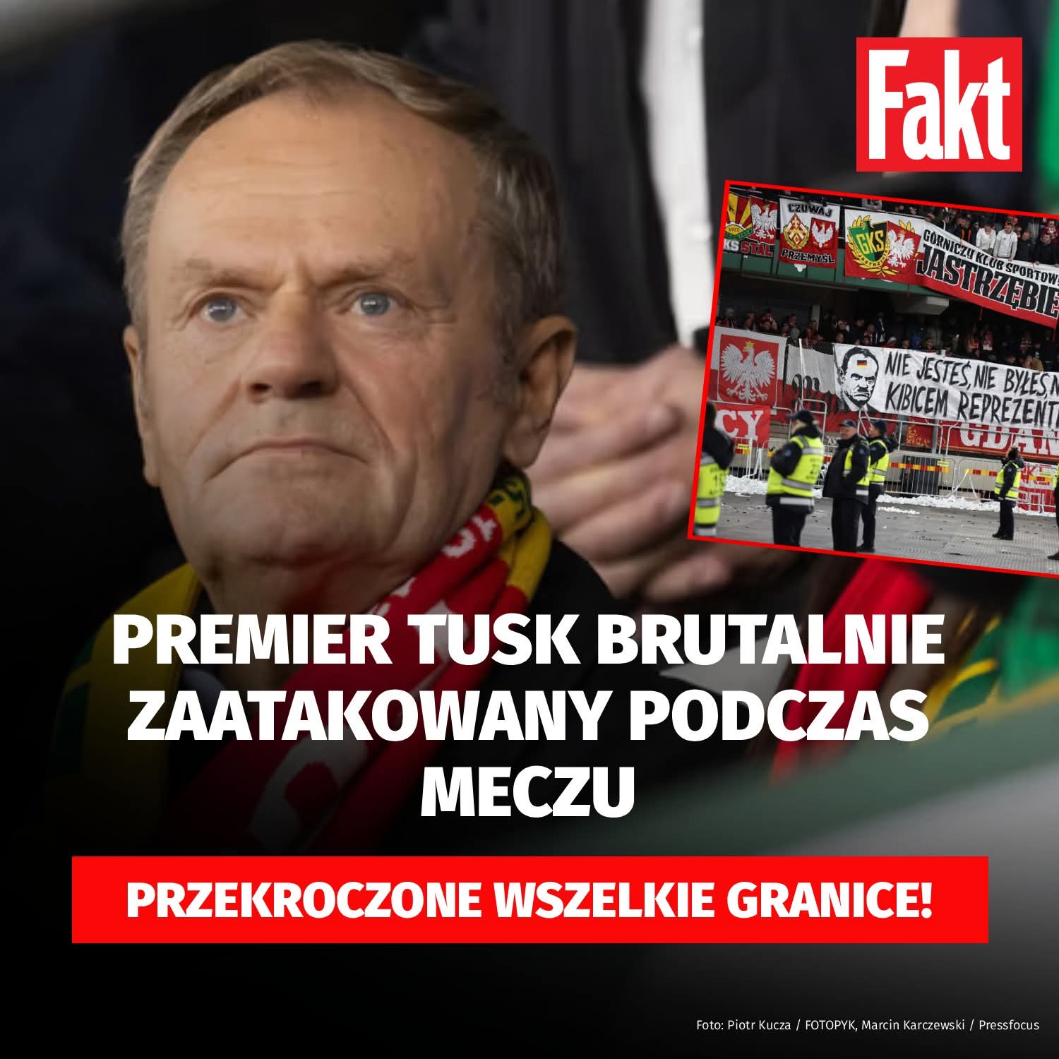 Ponadto, na trybunach zawisł obraźliwy transparent skierowany w stronę szefa rządu: „Nie jesteś, nie byłeś i nie będziesz kibicem reprezentacji Polski”, a wizerunek Tuska był opatrzony rysunkiem niemieckiej flagi na czole — przesłanie nacechowane mocnym politycznym wydźwiękiem.