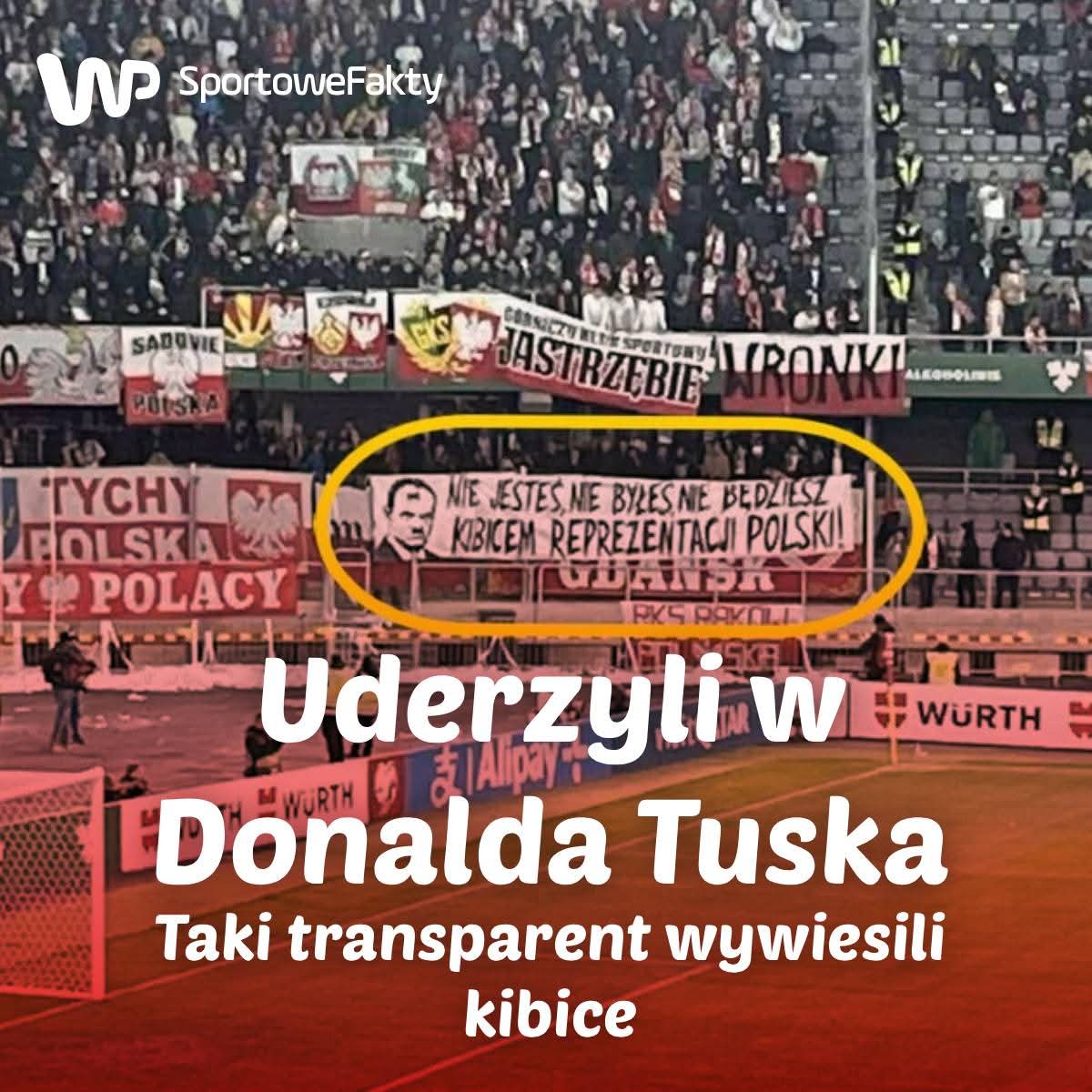 Na sektorze gości wywiesili wymowny baner z napisem: “Nie jesteś, nie byłeś, nie będziesz kibicem reprezentacji Polski” (patrz zdjęcie) z wizerunkiem Tuska.