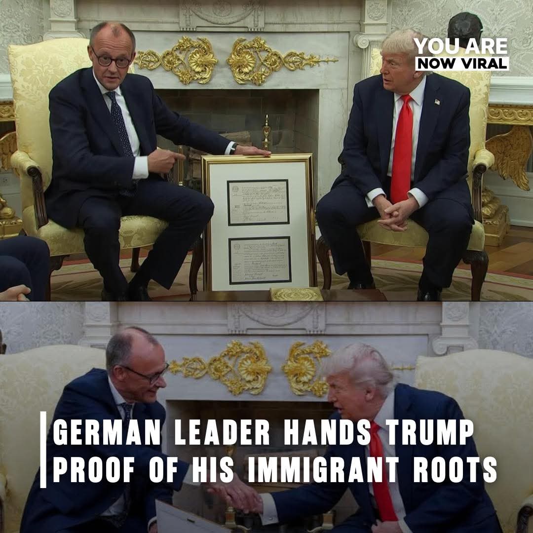 JUST IN….A routine diplomatic meeting took an unexpected turn when German leader Friedrich Merz presented President Donald Trump with a copy of his grandfather’s birth certificate, underscoring Trump’s immigrant family history. Trump’s grandfather, Frederick Trump, was born in Germany before immigrating to the United States in the late 1800s. The symbolic gift immediately ignited backlash and debate online, with critics Within hours, social media lit up with arguments over identity, heritage, and hypocrisy, Read the full breakdown to understand why the Internet can’t stop talking..
