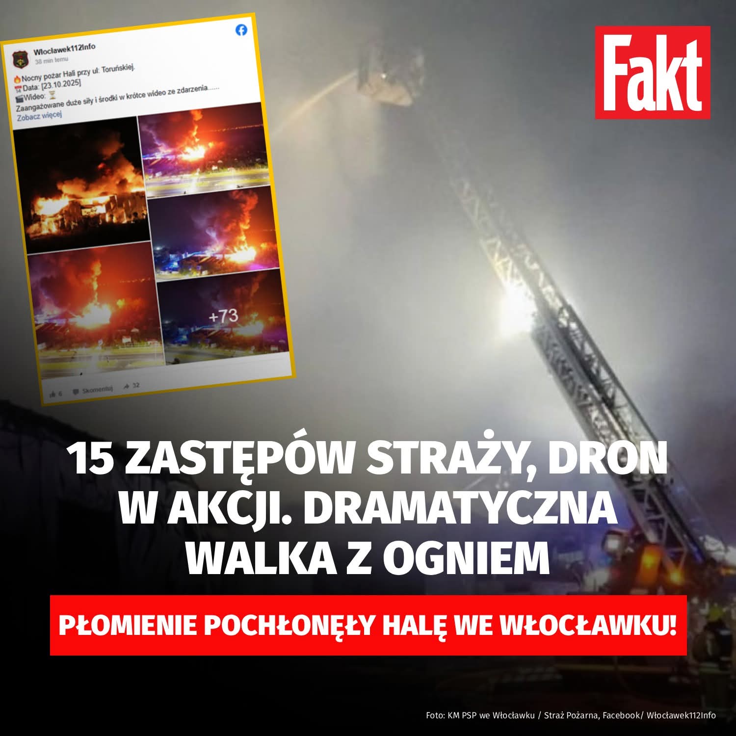 — Po przybyciu pierwszych jednostek okazało się, że ogień objął już około 75 proc. obiektu — przekazał bryg. Mariusz Bladoszewski z włocławskiej straży pożarnej. Na miejsce zadysponowano aż 15 zastępów, łącznie około 73 strażaków. W akcji uczestniczyła także grupa operacyjna z Komendy Wojewódzkiej PSP w Toruniu.